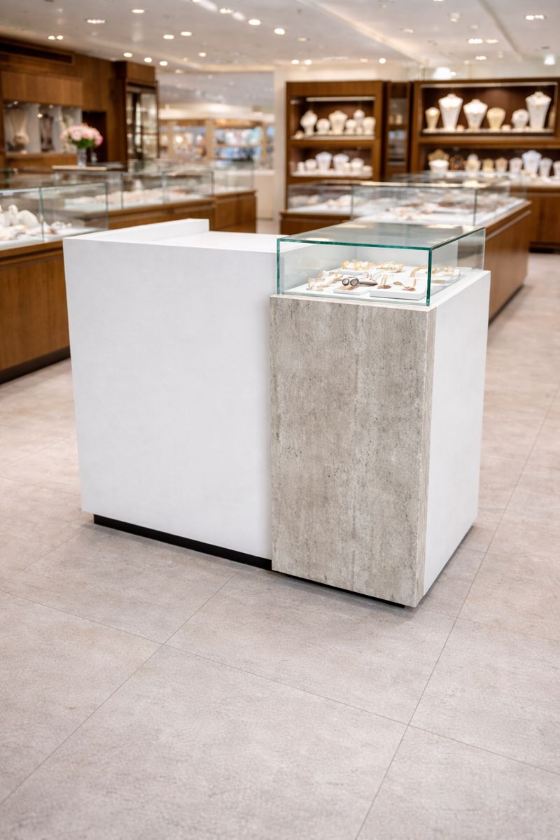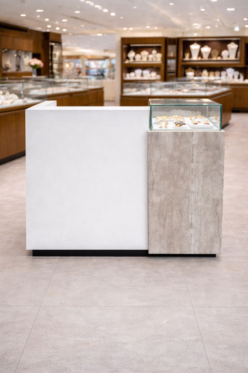 Nowoczesna wyspa ekspozycyjna przeznaczona do salonów jubilerskich, butików premium oraz przestrzeni handlowych typu showroom. Minimalistyczna forma połączona z eleganckimi materiałami zapewnia doskonałą prezentację biżuterii oraz komfort użytkowania.